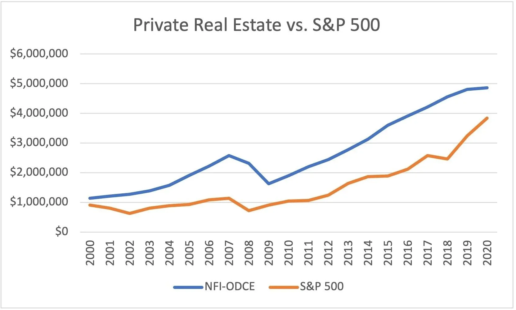 This is a major mistake because many real estate strategies – and private equity real estate in particular – have outperformed stocks. This isn’t just an issue for RIAs and individuals, many institutions and endowments have been underweight real estate in their portfolios and as result, have underperformed their peers. To give you an idea of what many are missing, the below chart is of the NCREIF NFI ODCE index, which is an index of core commercial real estate property types held in diversified funds. The ODCE index typically has lower returns than other private equity real estate strategies and it still outperformed the S&P 500 over the past 20 years.